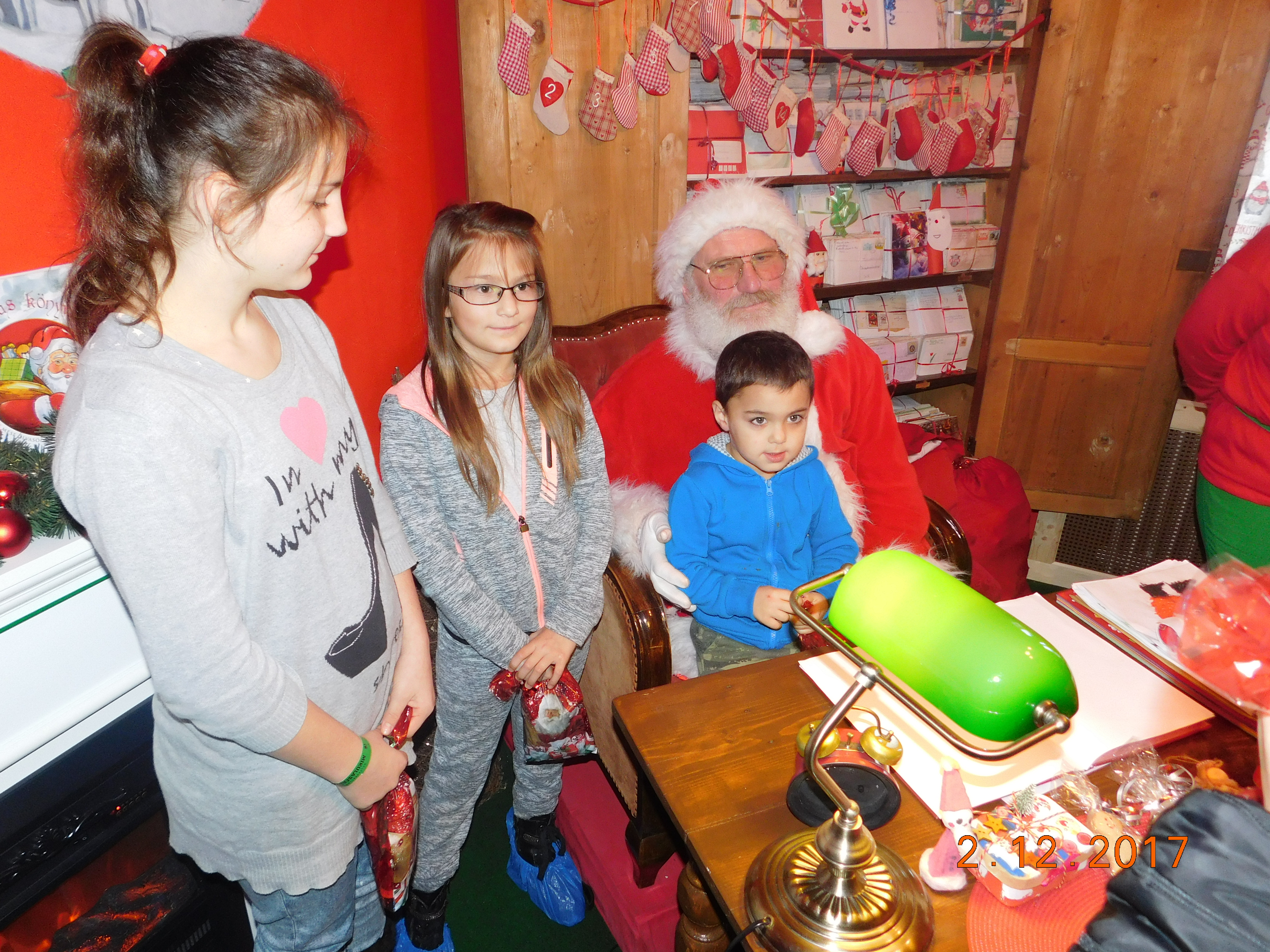 Megérkezésünk után hamarosan be is jutottunk a Mikulás bácsi birodalmába. Az előszobájában kedves manók fogadtak minket, és még játszani is volt lehetőségünk. Aztán hamarosan be is jutottunk hozzá. Ő nagyon aranyosan fogadott minket, majd egyenként odaadta a nekünk szánt csomagot is. Miután elköszöntünk Tőle, az udvarában megcsodáltuk a szánkóját és szarvasait is.